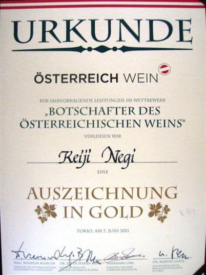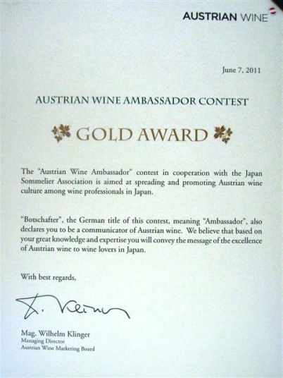 幸運にもオーストリアワイン大使の称号を授与されました。